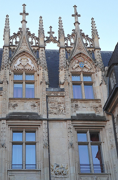 18世紀の木組み建築の建物が並ぶピュセル(ジャンヌ・ダルクの別称である乙女の意味)広場にあり、ホテルはルネッサンス建築の6世紀の建物なので、町の名所のひとつのように観光客が建物をひと目見たいと中庭を覗き込む。確かにファサードは鑑賞に値する壮麗さ。1520年の仏国フランソワ1世と英国ヘンリー8世の有名な会合である金襴の陣をテーマにした装飾で、一番上の馬2頭は建物を建築させた領主ブートルードの家紋である。