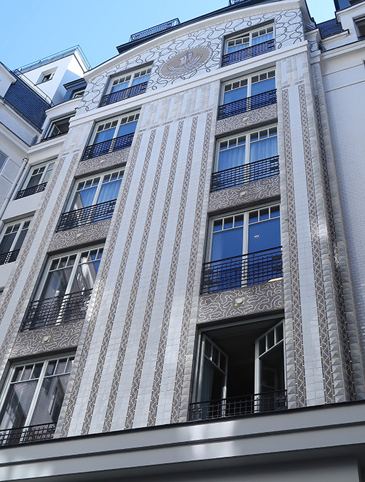 新しく作られた中庭に面した外壁は、アールデコ・スタイルのモザイクタイルで覆われている。photo:Mariko OMURA