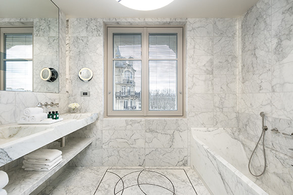 カラカラの大理石で覆われたバスルーム。バスタブは大理石をくり抜いたものという贅沢な作りだ。アメニティはエルメス。©Mathieu Fiol