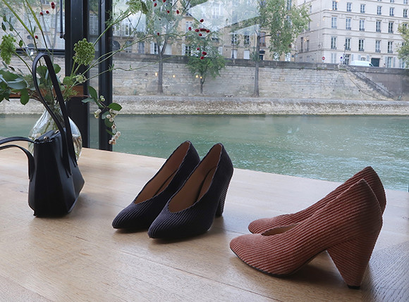 コレクションの発表はセーヌ河に浮かぶバトーレストランにて。パリの歩道に小粋にヒールの音を響かせそうな、コーデュロイのパンプスも登場。