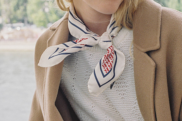 シンプルなコートとニットの装いに、Rのロゴスカーフでちょっとヴィンテージタッチをプラス。