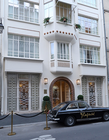 「架空の素晴らしい宝石箱。その中で、ロマンティックで古めかしいノスタルジーがダイヤモンドのようにきらきらと輝いている」とスタルクが語るヌフ・コンフィダンシエル。通りに面したガラスには山名文夫がその昔、資生堂のクリームや化粧水のパッケージに描いたような曲線が見られ、目を引く建物。黒塗りの車は宿泊客用ではなく、オーナーの持ち物だそうだ。