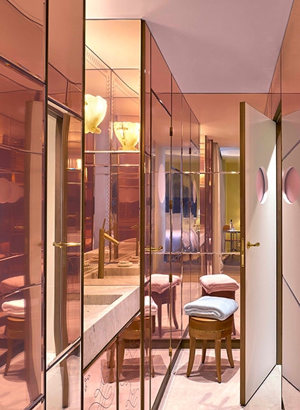 パステル調のフェミニンな室内。ホテルにはスパはないが、マッサージやスキンケアのルームサービスがある。使用するのはCodage(コダージュ)の品だ。