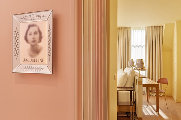 ホテルのインテリアは1920〜30年代のアールデコ調をミックスした折衷スタイルでまとめられている。淡い黄色に淡いパープルのランプシェード……女性の私室といった印象のフェミニンな内装だ。室内に漂うパステル・ドリームは、淡いピンク系の鏡張りのバスルームへと続く。各部屋にルームナンバーだけでなく、リュシエンヌ、オデット、ジャクリーヌなどといった古めかしい女性の名前もつけられている。