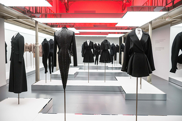 赤と白でまとめた会場に、主に黒とベージュの服を展示。photo:La Mode en Images-Stéphane Aît Ouarab