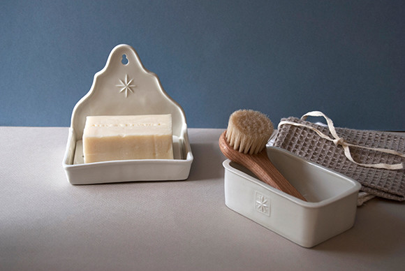 石鹸を買ったら、きっとアリックス・D・レイニスの白い石鹸置きも欲しくなる。壁掛け式(左)は75ユーロ。置き式は32ユーロ。