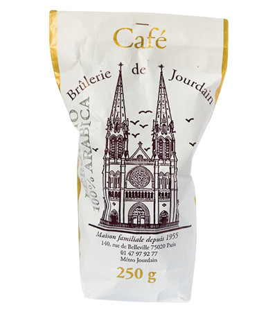 1955年創業、老舗焙煎店のコーヒー豆。すぐ近くにエディット・ピアフが洗礼を受けた場所として有名なサンジャン・バティスト・ドゥ・ベルヴィル教会があり、パッケージにはイラストが描かれている。