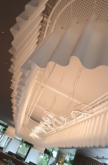 店名のPolichinelleが流線形のネオンで描かれ、レストランの中央を照らす。ポリシネルは即興劇コメディア・デラルテのキャラクターの名前。この命名にはスティーブが彼の妻に贈る愛の物語がこめられている。