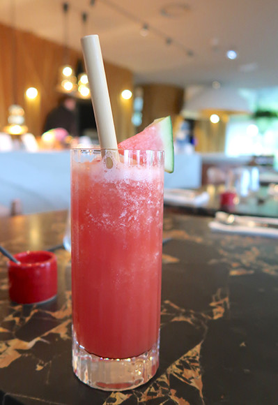 野菜、果物のカクテル(7ユーロ〜)で季節の味を。ストローはプラスチックではなく竹製だ。