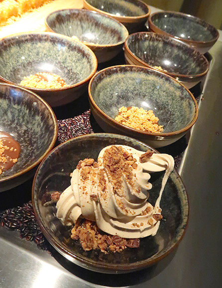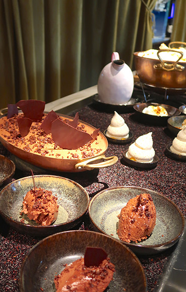 長いカウンターを進んで行くと、デザートのコーナーとなる。甘い誘惑光線を発しているのは、スティーヴと組んでポリシネルの冒険にのりだしたクリストフ・ミシャラックによるパティスリーの数々。野菜嫌いもポリシネルに来れば、野菜が好きになること請け合いだし、最後の甘い締めくくりがうれしくて、野菜を食べにポリシネルにまた足を運ぶことになるだろう。ディナーはビュッフェ(飲み物別39ユーロ)なのでカウンターに並ぶ料理もデザートも、すべてを味わえるチャンス !