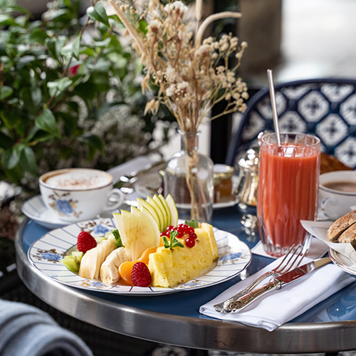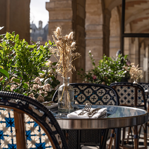 窓の下、美しいヴォージュ広場が広がるホテル。昨年末にオープンした「Cour des Vosges(クール・デ・ヴォージュ)」はかつての個人邸宅を改装した18室のリュクスなホテルだけれど、滞在する人もしない人も誰にとってもうれしいことに、地上階には広場に面したサロン・ド・テがある。6月2日、パリ中のカフェやレストランのテラス席同様に、その回廊のテラス席が再開した。