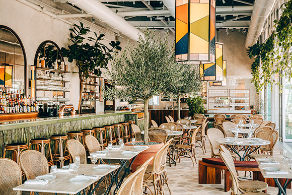 籐の椅子、オリーブの樹……地中海の気分が漂うレストラン。photo : Jérôme Galland