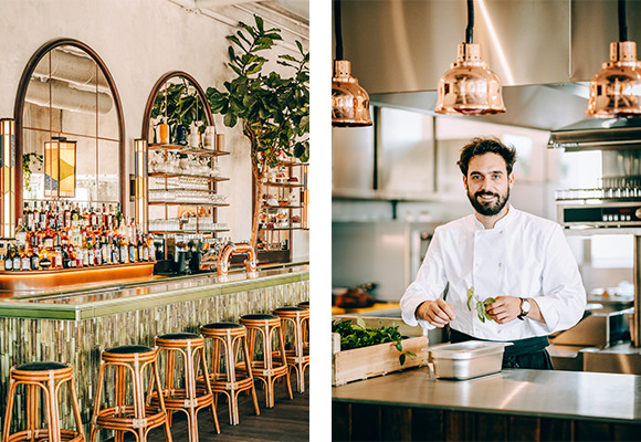 左:竹のタイルのカウンターの上のガラスケースと壁の棚に、アーティストのファニー・シェ・ブリヤンによる本物そっくりのフェイクのパティスリーが並ぶ。右:レストランのオープンキッチンに、畑からの作物が届く。ウルトラ地産地消!! photos : Jérôme Galland