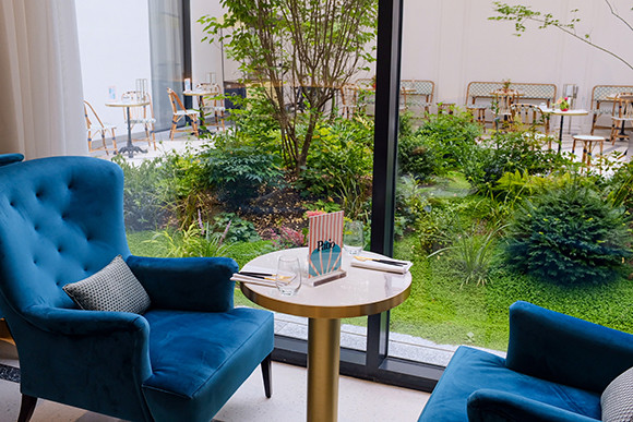 1階ロビー。パティオに面した側は、歴史を意識した通り側のインテリアと異なり明るい雰囲気に満ちている。Photo : MEERO