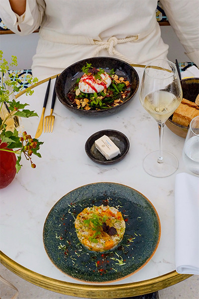 ここ「Le Patio du Vendôme(ル・パティオ・デュ・ヴァンドーム)」ではランチもディナーもとれ、そして毎日10時から23時までの営業なので、朝食やティータイム、アペリティフ、それに半端な時間の食事のための利用もできる。たとえば、グラスワインは6ユーロから。界隈のなんということのないカフェと変わらぬ価格で、ずっとオシャレに味わえるうれしい場所なのだ。食事メニューには、いまパリで欠かせない料理が並んでいる。前菜にはブッラータにクートー(マテ貝)、メインにはカラフルトマトやハンバーガー、そしてタコのグリル。デザートには「Une Glace à Paris(ユヌ・グラス・ア・パリ)」のアイスクリームも。