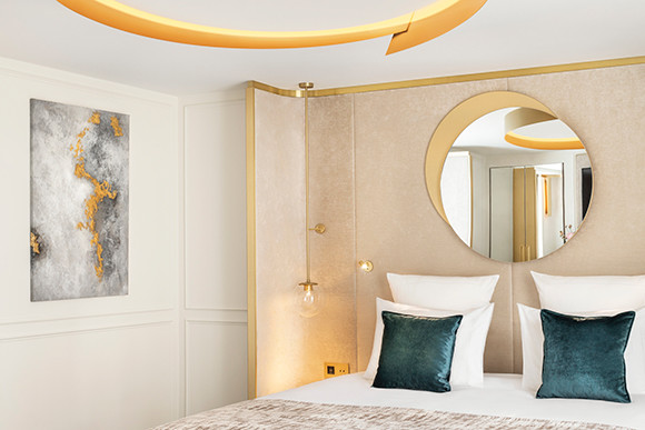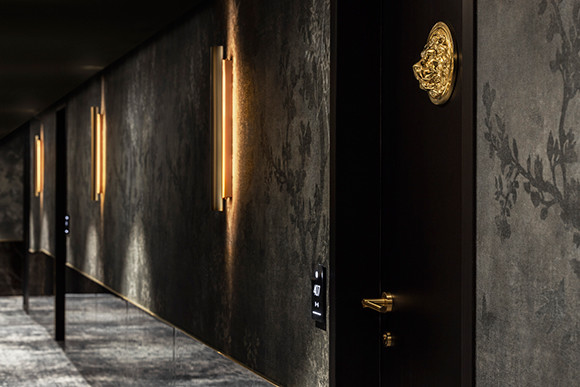 ホテルは5つ星。内装を手がけたのはファビアン・ロックで、建物が持つユニークな歴史へのオマージュとして、随所に金色の獅子(リヨン・ドール)のモチーフを散りばめた。客室のドアには獅子の顔、パブリックスペースの壁のフレスコ画には獣の斑を感じさせるゴールドの抽象的な模様というように。