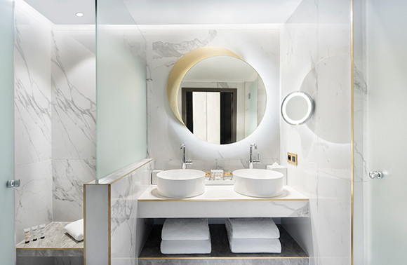 大理石の冷たさを生かしたミニマルで清潔なバスルーム。©K_Pitures_Stefan _Kraus
