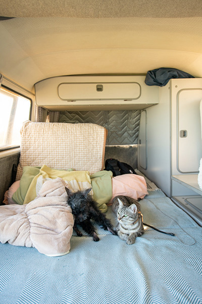 車内にて。こうして見るとあづきが「いやー」と猫を避けているように見えますが、老化のせいで自然に身体が回転しちゃうだけで2匹はケンカもせず、意外と仲良くやってます。