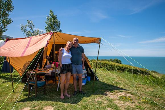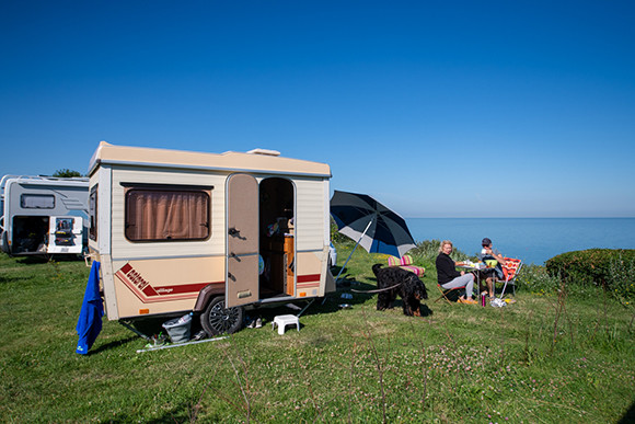 80年代ヴィンテージ、折り畳めるキャラバンと犬連れキャンプを楽しむのは、フランス人カップル。もうキャンプ歴40年と言っていました。