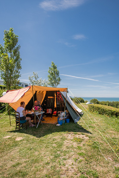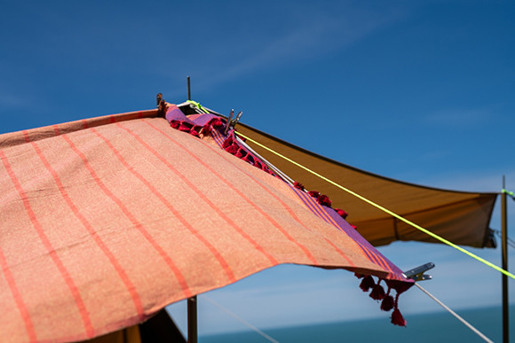そして、海を望む一等地にタープで快適な居住空間を作っているのは、オランダから来たおふたり。この場所が気に入って10年間欠かさず、毎年夏に2週間通っているそうです。木製の椅子は近くに住む友人宅に預けっぱなしで、自分たちが来た時だけ引き取って使っています。友人宅、倉庫か!