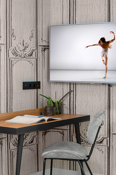 部屋の一角には18〜19世紀の建築物の木の壁のウォールペーパーが使われ、クラシックな雰囲気をプラス。バスルームはモダンにまとめられている。