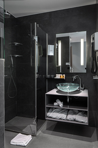 その隣にはルネサンス期スタイルの女性のポートレートが。バレエとクラシック音楽をテーマに選ばれた2作品である。ホテルの名前に付けられている“リリック”とは、古代ギリシャの竪琴(lyre)を語源とし、歌詞や叙情詩を意味する言葉。たとえばパリ・オペラ座では演目の別を表現するのにバレエとリリックというように、この言葉をオペラ(歌劇)を指して使っている。立地にふさわしい命名がされたホテルなのだ。内装を担当したのはヴィルジニー・ダルモン・ランパッツォ。1階のフロントから客室にいたるまで目に穏やかなトーンでまとめ、客室は木の床の上には厚めのカーペットを敷き、と、静けさを感じさせるホテルを作り上げた。ウェルビーイングスペースがあり、8×3.5mと大きくはないけれど温水プールやハマムを利用できる。日中ショッピングや観光にアクティブに行動した後は、ホテルで安らかな休息。そんな旅の理想が約束されているようだ。