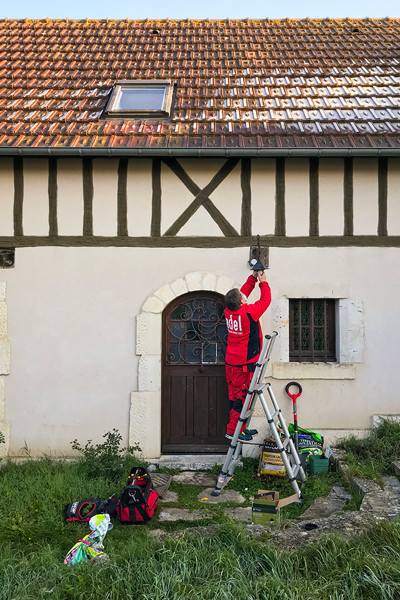 さて、8月以来だいぶご無沙汰してしまいました。現在フランスはロックダウン中ですが、庭の進捗をお伝えします。例によって、ほとんど進んでいません、、。周りからはそう見えないかも知れませんが、秋が終わる前に春の準備をせねばとかなり焦ってます。元来〆切がないと何もしないタイプで、昨年はあっという間に1年過ぎてしまいました。今年はそうはさせない!←いや、もう11月だし。写真は電気屋さんが、玄関の外灯を取り付けているところ。1年以上も裸電球のまま放置されていたんですが、ようやくランプを取り付けられました。
