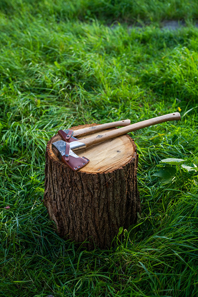大きすぎる薪を割るための斧も入手。丸太はご近所から譲ってもらいました。