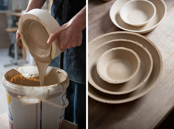 左:TOP TOPでの作業は、石膏で型を作ることから始まった。 右:980度で焼きあげたら、アントワネット・ポワソンへ。photos : Jean-Christophe Torrès