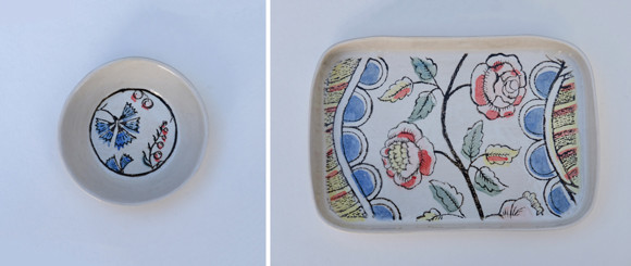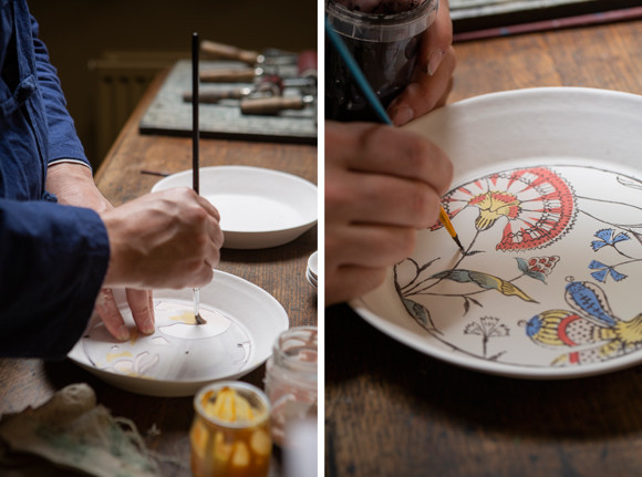 型紙にあわせてモチーフの輪郭をとり、彩色。そしてTOP TOPで釉薬をかけて、1280度の窯へ。photos : Jean-Christophe Torrès