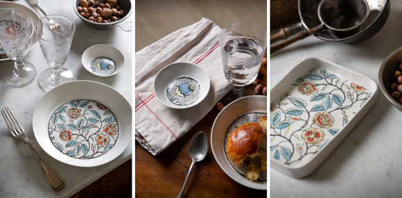 食いしん坊で料理好きなふたりは、古い食器をコレクションしている。彼らを引き付けるのは、新しい品には見いだすことができない職人の手仕事が生む魅力。TOP TOPが焼いた砂岩の陶器にアントワネット・ポワソンがモチーフをつけ、それをTOP TOP が再び焼いて仕上げるうつわには、アンティークの懐かしい風合い、温もりのある手触りが感じられる。それというのも、うつわのフォルムは古い食器にインスパイアされていて、さらにアントワネット・ポワソンが復活した18世紀のドミノペーパー同様に型紙を使用して枠を描いたモチーフの内側に筆で彩色して、という繊細な手作業ゆえ。