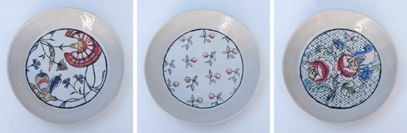 写真は大皿(各95ユーロ)。小皿(75ユーロ)に描かれる模様は同じテーマでも異なるモチーフだったり、モチーフ数が少なかったり。photos : Jean-Christophe Torrès