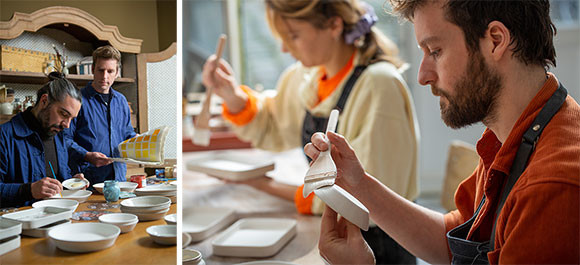 「いまの時代、お皿のような実用品のために手描きされる陶器というのは、フランスではほぼ存在しなくなってるんですよ」と語るヴァンサンに、ジャン=バティストが続ける。