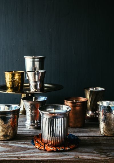 ブラス、錫、ブロンズ……メタルの器のキャンドルは落ち着きのあるシックな雰囲気。photo:Elise Dumas @thepineapplechef