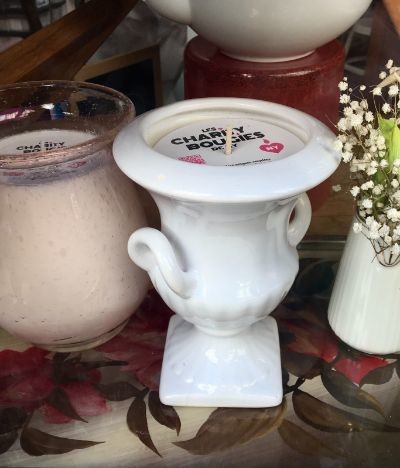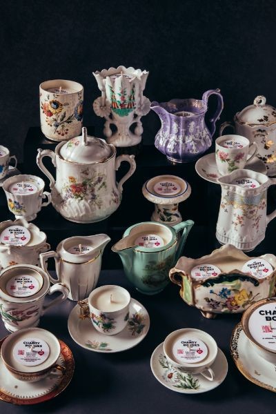 2017年に生まれた「Les Charity Bougies(レ・チャリティ・ブージ)」。ティーカップ、ミルクポット、ワイングラス、キャンディボックス……スタイルさまざまな古いオブジェを容器に用いたキャンドルコレクションを提案する。ブランドの創設者は、かつてプレスオフィスを主催していたナンシー・シャベールで、時代を経たオブジェはフランスの慈善目的の組織や人道支援団体などから購入している。それら器に流し入れるのはヴィーガンワックス。環境保護、社会発展、地域産業振興を柱にした活動のGo For Goodを数年前から推進するギャラリー・ラファイエットがレ・チャリティ・ブージにすぐに目をつけたのも、もっともだろう。