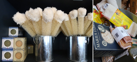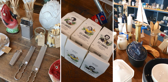 左:ナイフ、チーズおろし、木ベラなどチョイス豊富だ。 中:石鹸、オイルなどフランス産のナチュラルビューティーブランド「Les Candides」を扱っている。 右:卓上の喜びもキャロリーヌは提案。photos:Mariko Omura