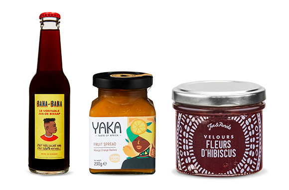 左: マンゴ、オレンジ、バオバブのフルーツスプレッド。 中: ハイビスカスのジュースBana Bana 3.50ユーロ 右:ハイビスカスの花のジュレ 8.99ユーロ
