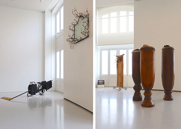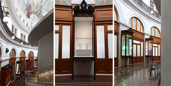展示作品は見てのお楽しみ。1階の吹き抜けの広場(ロトンド)では、ワックスの10作品が人々の好奇心をそそっている。中央の彫刻、周囲の椅子、男性観光客は開館以来燃え続け、床には彫刻から燃え落ちた外れた腕が床に転がっていたり、と開館と同時に駆けつけた人が味わえなかった体験が待っている。これらワックスの作品がどのような終焉を迎えるのか、気になるところだ。この広場を囲むコンクリートのシリンダーの周囲の通路には、ショーケースに収められたベルトラン・ラヴィエの複数の作品が展示されている。