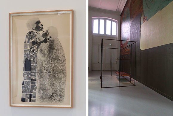 デイビッド・ハモンズの作品より。左: クリムトの『接吻』にインスパイアされた作品『Untitled』(1975年)。 右:『Minimun Security』(2007〜2020年)。スティール、石、5分46秒のビデオで構成された作品だ。