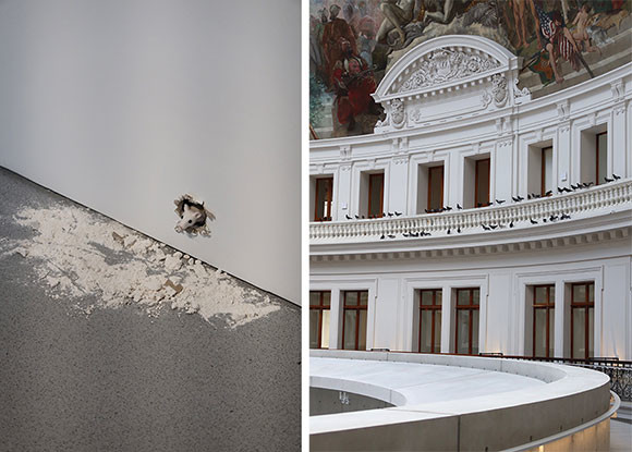 左: ライアン・ガンダーの『/…/…/…,2019』。壁の穴から覗かせた顔を振りながら、僕は……僕は……と繰り返すネズミ。 右: マウリツィオ・カテランの鳩が見下ろす。まるでスーパーマンを探すように、地上階から“鳩はどこだ?”と上を見上げる来場者も。photos:Mariko Omura