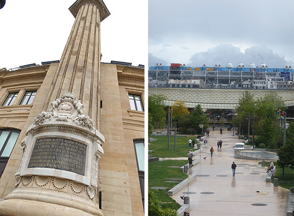 左: 16世紀、カトリーヌ・ドゥ・メディチの邸宅時代の名残の塔。 右: ブルス・ドゥ・コメルスの裏手の庭はフォーラム・デ・アール、さらにポンピドゥー・センターへと続いている。