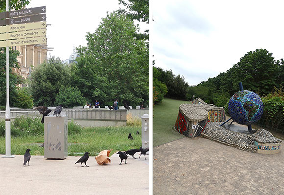 左: 裏手の庭の鳩は、館内の鳩と違って本物だ。 右: モザイクタイルがガウディによるグエル公園を思わせる子ども公園。photos:Mariko Omura