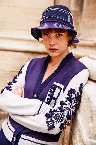 バリーのカプセルコレクションからカーディガンとハット。モデルには女優のマティルド・ヴァニエが起用された。