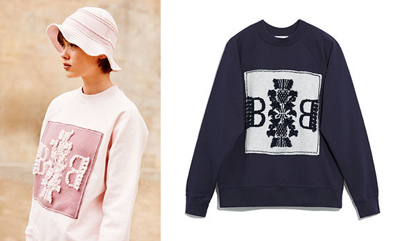 イニシャルとアザミの3D刺繍を施した30cm四方のカシミアはTシャツ(左)の色数が増え、またスウェット(右)もお目見え。