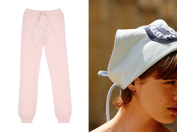 左: カシミアのジョギングパンツはパステルブルーと2色。右: ロゴを生かした三角スカーフ。胸元にも頭にも。