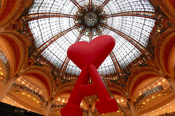 ギャラリー・ラファイエットでは8月31日まで夏のキャンペーン<Paris Mon Amour(パリ・モナムール)>が催されている。昨年から観光客がすっかり減ったパリで苦戦を強いられたデパートとしては、カルチャー、ライフスタイルといった面からパリの魅力を伝えるイベントを催して回復力をアピールしなくては。そのシンボルは、デパートでおなじみの高い丸天井の上から吊り下げられた赤いハートだ。これはAMI PARISのアレクサンドル・マテュッシがデザインしたブランドの人気のロゴ。どのフロアにいても目に入る吹き抜けに浮かぶ巨大な赤いハートに、心が和みそう。