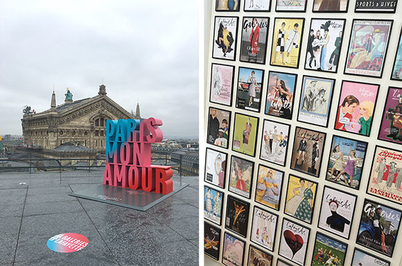 左: レストランが2つあるルーフトップまで、ギャラリー・ラファイエットはパリ・モナムール! 右: ルーフトップに向かう途中、昔の広告ビジュアルが展示されているので鑑賞を。photos:Mariko Omura