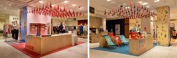 ショッピングについては、パリで買い物心をそそる売り場が用意されている。いまの時代、それはフランス生産の商品。各フロアに特設された売り場は、天井に飾られた赤と青のエッフェル塔が目印となっている。ここではアトリエ・ド・パリが提供するメイド・イン・パリ認証ラベル付きの商品も販売中だ。 また1階エントランスホールにはディズニーランドグッズを販売するコーナーも設けられている。さらにムーラン・ルージュ、ヴェルサイユ宮殿、懐かしのシトロエン2CVでパリ観光、セーヌ河クルーズなどギャラリー・ラファイエットは観光業者とタイアップし、こうした体験ができる抽選も館内で実施中。キャンペーンは建物の外にも続いている。写真家 Thibaut Grevet (ティボー・グルヴェ)が撮り下ろしたコンコルド広場、エッフェル塔、サンマルタン運河、ピガール地区といったパリの象徴的な場所の写真がショーウィンドウを飾り、来館しない人にも“パリモナムール”と囁きかけるのだ。