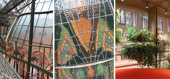 左、中: ステンドグラス、その裏側。 右: 改装された靴売り場から、クーポールのステンドガラスを裏手から眺められるようガラス窓が設けられた。photos:Mariko Omura