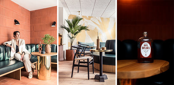 左: デザイナーのゲザ・ハンセン。このスペースの向かいにテラスがある。 中: レセプションホール。 右: Orsoのオリジナルカクテルも。photos:(左、中)Romain Ricard、(右)birdfoodandco